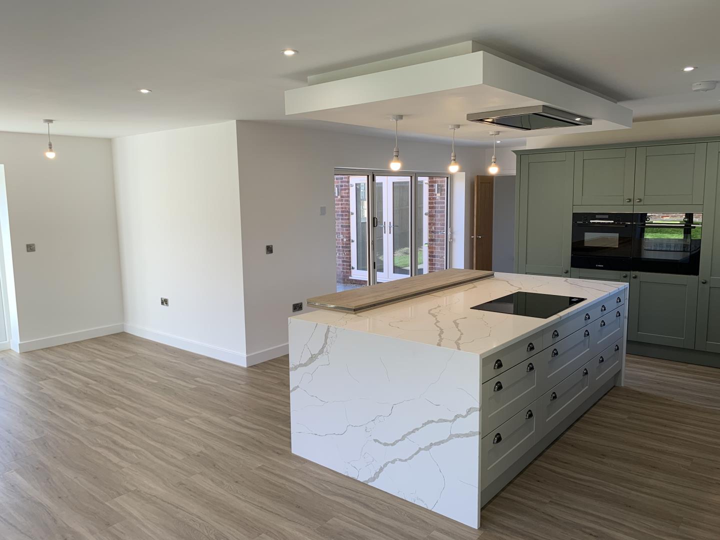 The home is built to the highest standard and finished to an exceptional specification that exceeds expectations of new-build homes. Just a few examples of this include a designer shaker-style kitchen with a larder unit, waterfall Quartz worktops, Bosch appliances including an integrated full height fridge and freezer, integrated double ovens and dishwasher, along with modern, stylish bathrooms with designer, large format, full height